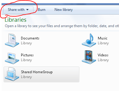In order to share one of our libraries via a homegroup, we simply go back to the libraries window, and select Share with.