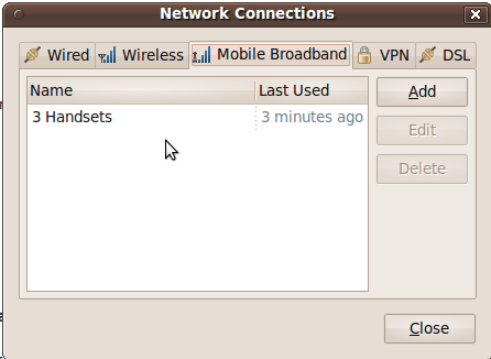 Ok… so at this point I had a functional bluetooth pairing. In order to initiate the internet connection I clicked on the “setup” icon and chose “dial up networking (DUN)”. This asked about my provider, just like windows did, and I had a new connection called “3 Handsets” in network manager. Right clicking on network manager and selecting the “edit connections” option shows a new mobile broadband tab with the aforementioned connection: