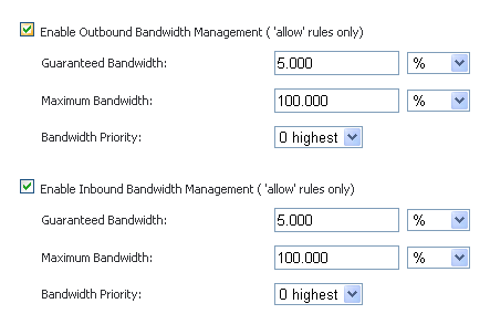 - Web Browsing Traffic (HTTP/S) : priority 1, and about 75% guaranteed bandwidth. This traffic will account for the main volume of traffic, so this is where the core of our BWM policy resides. I allocate a maximum bandwidth of 100%, and a guaranteed bandwidth of 75%. In other words, at any point in time, HTTP/S traffic should have 75% of the bandwidth available. If HTTP/S is not using this bandwidth, it should be available to other traffic