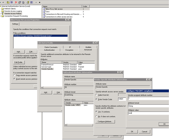 Building on one of my previous posts (look here), I now wanted to integrate a bluecoat ProxySg more tightly into RADIUS. One of the Proxy features is to be able to build policy based on RADIUS groups. The easier method to do this would be to simply use a standard RADIUS attribute such as Filter-ID, and manually map these to groups via CPL policy in the BlueCoat itself. But I never like the easy way 😉