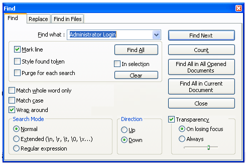 - By far the handiest feature of notepad++ is the concept of bookmarks. This enables you to select, copy, cut all lines with an instance of a string. For example. say you would like to find all entries / lines in a log containing “Administrator login” to see at what times an admin logged into the unit. CTRL+F brings up the find function. Type in the search term and select the “mark line” and hit the “Find All” button. This will bookmark all the lines containing that term. Once completed, from you can copy/delete/cut all these bookmarked lines from the search > bookmark menu. Its useful for cutting down on the information you need to process.