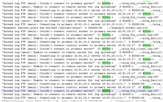 - Last but not least, in notepad ++ if you highlight a single word (not a string of words), the viewer will highlight all other instances of the word in green. I find this extremely handy because most log files include a process ID, so highlighting this process ID will highlight all other lines with the same ID, making it easier to track (example below tracking PID E000A)