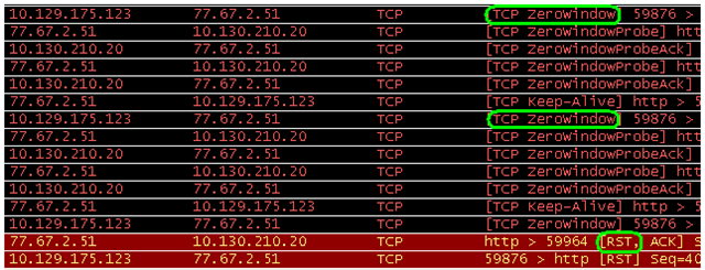 Note how the client is sending the TCP ZeroWindow, and eventually the server sends a RESET packet. The solution in this case was to reduce the tcp window size on the client (effectively slightly slowing down the connection)