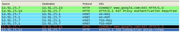 Note: In explicit proxy deployments, the above Kerberos authentication works for both HTTP and HTTPS site authentication, as evidenced by the below packet capture (notice the CONNECT request followed by Kerberos traffic)