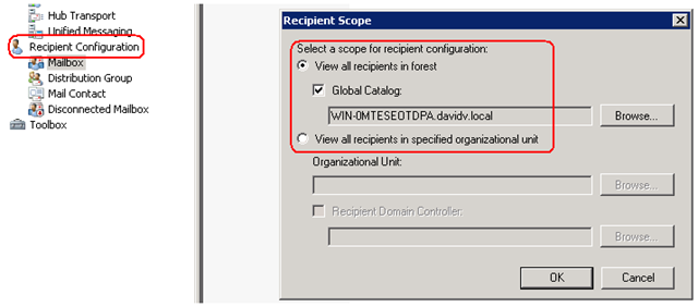 3. By default exchange will only show the existing users in the current (parent) domain. If you would like to configure recipients from existing users in another domain, for example the child domain, you will need to open Exchange Management Console > Right Click on “recipient configuration” > modify recipient scope. From here you can either choose users across the whole domain (view recipients in forest) or limit it to a particular domain / child domain