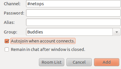 Once the correct account was setup in pidgin, the last configuration we needed was to instruct pidgin to automatically join our IRC notification room (called #netops)/ This was done via the Buddies menu > add chat, and ensure that “auto-join” is enabled