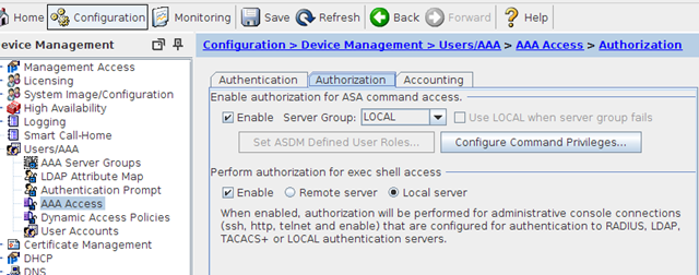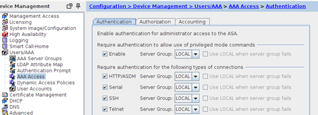 make sure all options are ticked and set to your appropriate AAA server (I am using the ASA itself in the below screenshot)