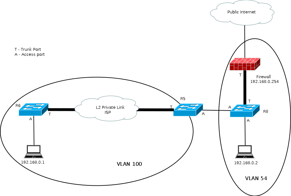 With such a configuration, vlan 100 and vlan 54 are able to communicate, and PCs within the VLANs (192.168.0.1 and 192.168.0.2 in my diagram) are allowed to be in the same subnet (hence no need for changing IP addresses), while the original internal VLAN 54 does not need to be changed to the ISP’s vlan, saving reconfiguration of switches and firewalls