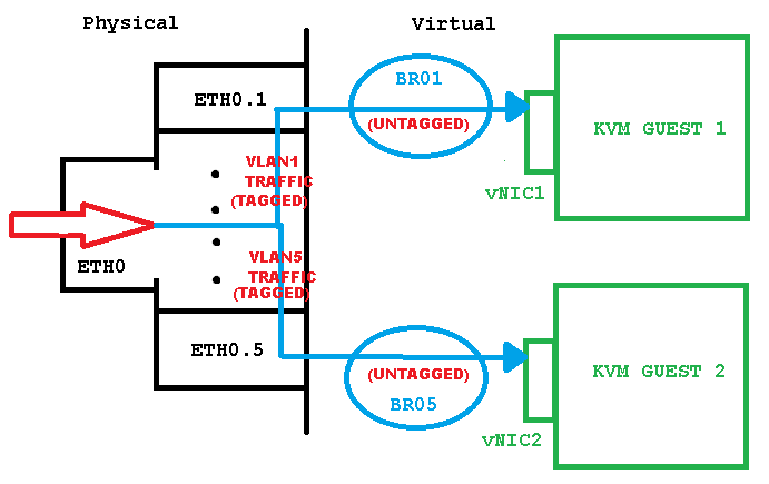 And now KVM GUEST 1 and 2 will be able to see tagged traffic from vlan 1 and 5. Of course the guest must be able to terminate the vlans themselves as they are now vlan aware.