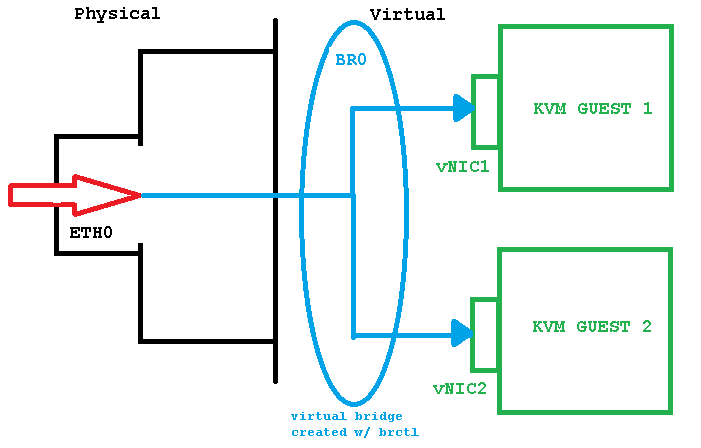 At this stage, the objective is to get eth0, vNIC1 and vNIC2 talking together. I wont focus on creating the actual KVM guests, plenty of documentation elsewhere on how to do that. We’ll keep our focus on the bridge, BR0. Creating the bridge is simple as is adding the member interfaces: