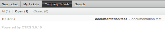 Logon as teamleader customer. Note that now you will see company tickets, which are all tickets opened by the teamleader’s team, in our example, the ticket “documentation test” which was created preciously by the user: