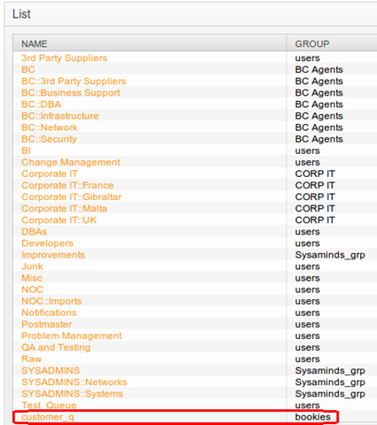 7. Important: check under Admin > Queue Settings > Queues and take note of which group the queue these users should see belongs to. For example, in the below screenshot we see the queue “customer_q” belongs to the group “bookies”.