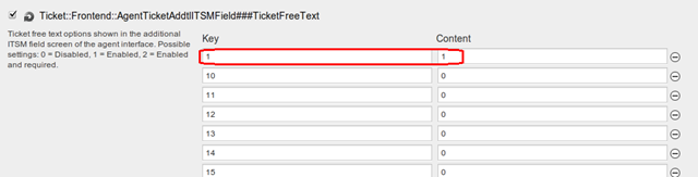 5. Scroll down to the “Frontend::Agent::Ticket::ViewAddtlITSMField##TicketFreText” heading and replace the value of “0” with a value of “1” for every FreeKey you enabled in steps 2 and 3 above. In our case only FreeKey1 was enabled, so we place a value of “1” next to key “1”.