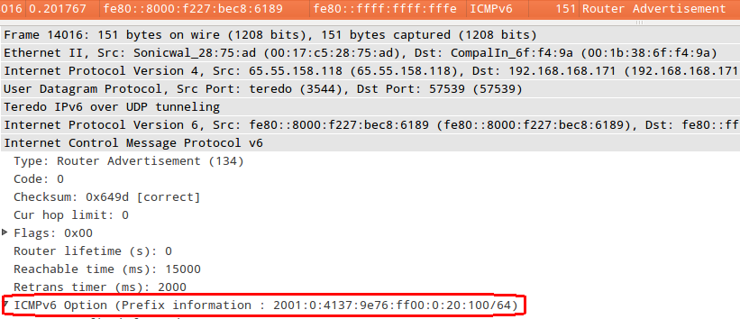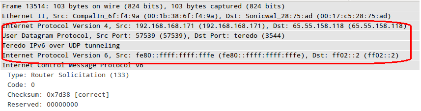 You can see the inner IPv6 header, encapsulated within a UDP IPv4 datagram on the outside. This transition method is the whole reason why isolated IPv6 “islands” can talk to each other over an as-of-yet predominantly IPv4 internet. As I noted in part 1, observers will note that I did not need any sort of DHCP server to get IPv6 addresses on other nodes in my home network. While DHCPv6 still does play a very important role, another, more automatic method has been introduced in IPv6. This is the router solicitation and router advertisement method. We can see two such packets here: