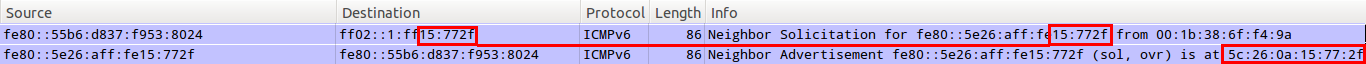 In the above screenshot you see the first packet as a “neighbor solicitation” for fe80::5e26:aff:fe15::772f“. Note I drew a relationship between the IP being asked for and the multicast address which the solicitation is being sent on. The multicast’s address last few octets match the MAC address, in fact this multicast address is built from the MAC address. While this is not a one-to-one relation (more than one node may process this multicast), it does significantly reduce the number of nodes that do actually process this packet. The second packet is the “neighbor advertisement” which you can see returns the MAC address.