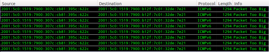 While sniffing, we also see a bunch of ICMP “packet too big” packets: