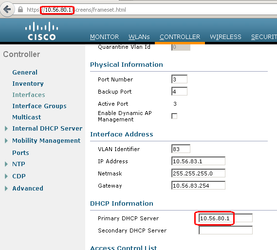 3. Under the Dynamic Interface settings (Controller > Interfaces > [select the dynamic interface]), insert the WLC management IP as a primary DHCP server: