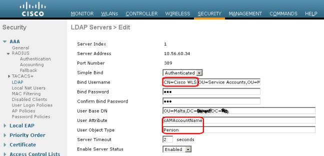 - The WLC only access the common name (CN) of the user, you cannot use the sAMAccountName or similar attributes within the Distinguished Name provided.