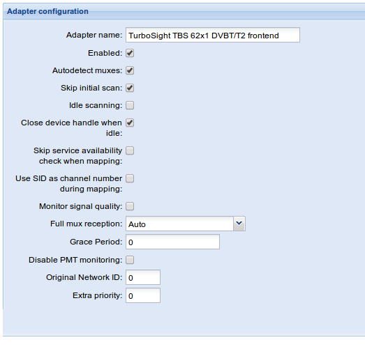- There is lots of advice on the ‘net about the proper DVB adapter configuration. The below worked for me. Of special note is the selection of “close device handle when idle“. The TBS6285 has a habit of not properly closing it’s device descriptor handle, so after some time (approx 24 hours), attempting to access a TV stream would result in the TVHeadend client showing “no input detected“. After some digging around in the logs, I found that in such TVheadend complains of not having the proper file/device descriptor, leading me to enable this option – and solving the issue