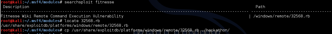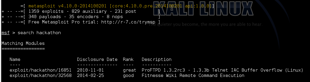 - Startup msfconsole and search for your exploit (I normally search for the folder name – hackathon – since I pretty much know what I placed in there)