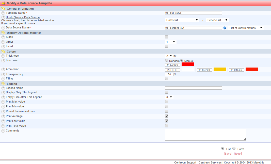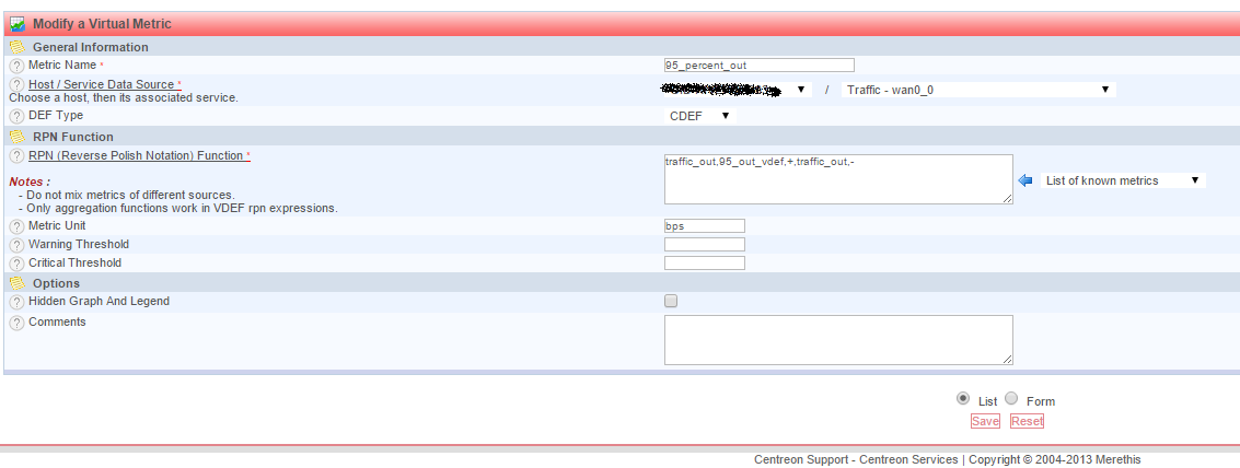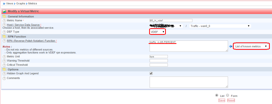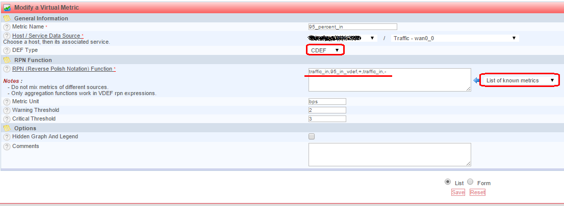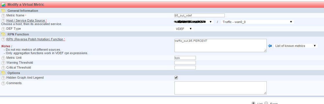 - Create a new metric. Enter a valid name, and select the host and service for which you’d like to plot the 95th percentile. Normally the host would be the internet facing router, and the interface would be the WAN interface