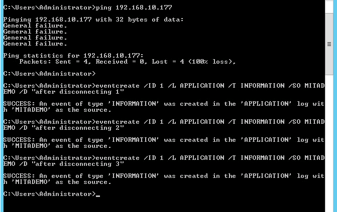 This simulated a general network failure, as shown by the ping results below. Immediately after, we generate a further three application logs (after disconnecting 1, after disconnecting 2, after disconnecting 3):