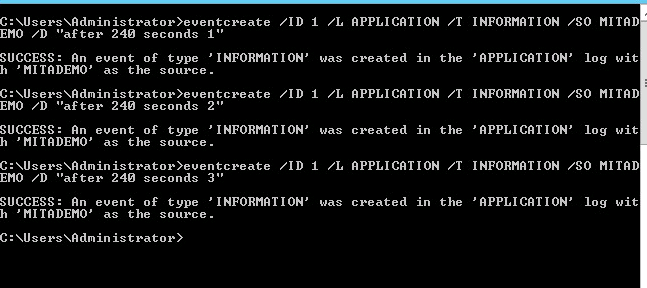 The above screenshot shows using the “eventcreate” command to generate two application logs: