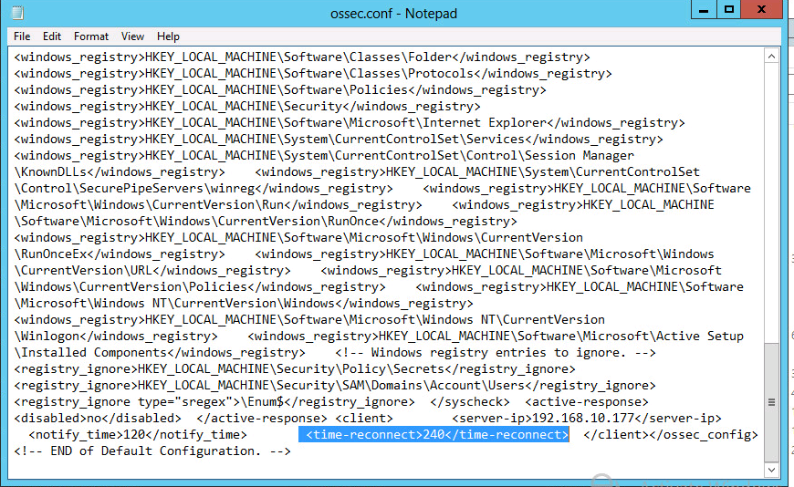 One can of course reduce the values of notify_time and time_reconnect. In the source code for the OSSEC agent, the default time_reconnect value is set to three times (3x) the notify_time value, which is a sane default in my opinion. There’s a trade-off here between performance and reliability, since OSSEC is UDP based, the only way of knowing if the OSSEC server is offline is for the agent to send periodic keepalives (notifications). Setting notify_time too low means more network traffic and processing on the OSSEC agents and server, but less logs lost in the event of a disconnection.