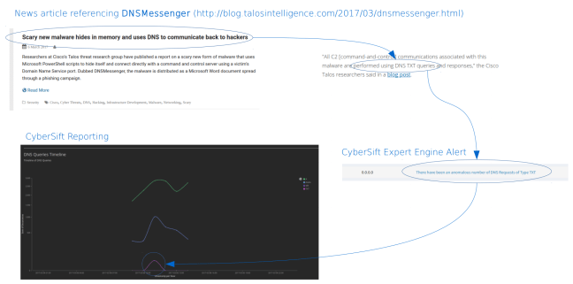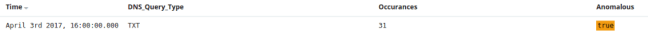 DNSMessenger used TXT records to create a covert channel, that would be difficult to detect. Looking at CyberSift’s output during testing, we see an alert that there was anomalous activity in our environment’s DNS activity: