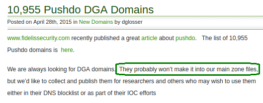 Typically these domains are quite random in nature, for example “intgmxdeadnxuyla” and “axwscwsslmiagfah”. That makes it quite easy for a human to pick out. The downside is that there are way too many DNS records to check manually, and automated malware domain lists don’t usually include DGA generated domains, there are simply too many and they change every day
