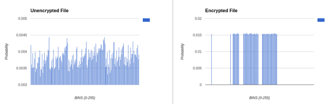 A simplistic explanation of entropy is “randomness” in a file. If we compare the probability distribution of an unencrypted file (MS WORD DOCX in this particular case) and an the same file encrypted we see the following: