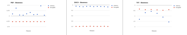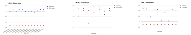 Since the histograms are different, the unencrypted and encrypted versions of a file have different skewness. Plotting this for different file types we get another marked difference (though it looks like HTML would give us some difficulty here):