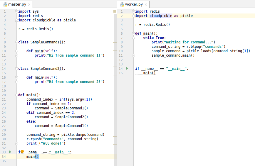 The code doesn’t do anything special. We define two sample classes (SampleCommand1 and SampleCommand2), and depending on script arguments we instantiate a class, pickle it, and send it to redis. The worker picks up the object from the redis list, unpickles it, and runs the “main” method. Running the scripts side by side (master on the left, worker on the right), it works pretty well: