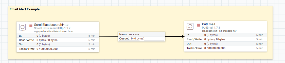 As the above screenshot shows, there isn’t much to it, drag and drop two processors: ScrollElasticsearchHttp and PutEmail. The most important thing to note is the choice of ScrollElasticsearchHttp over any of the other options. Scrolls are used in Elasticsearch when you need to traverse large datasets by splitting results into pages, each including a fixed amount of documents. NiFi puts each page entirely in memory, so it’s important to use scrolls when dealing with large datasets to avoid your server keeling over.