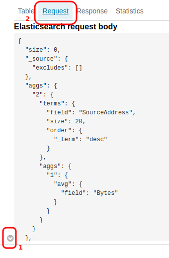 First off, if you’re already an ELK user, you’d notice the above is a very simple aggregation. Hint: one of my favorite ways for quickly building an aggregation query is using kibana: simply build a visualization like a Data Table, and then use the small arrow icon at the bottom (1) to reveal the “Requests” tab (2):